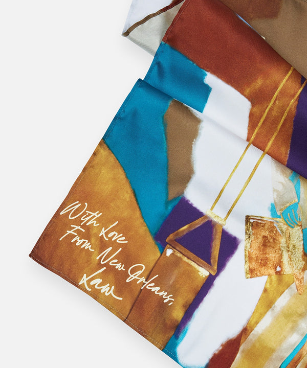 This beautiful printed bandana is a colorful work of art. It features digital printed art imbued with the spirit of New Orleans, signed off with a love note from the city, to be worn as you see fit.